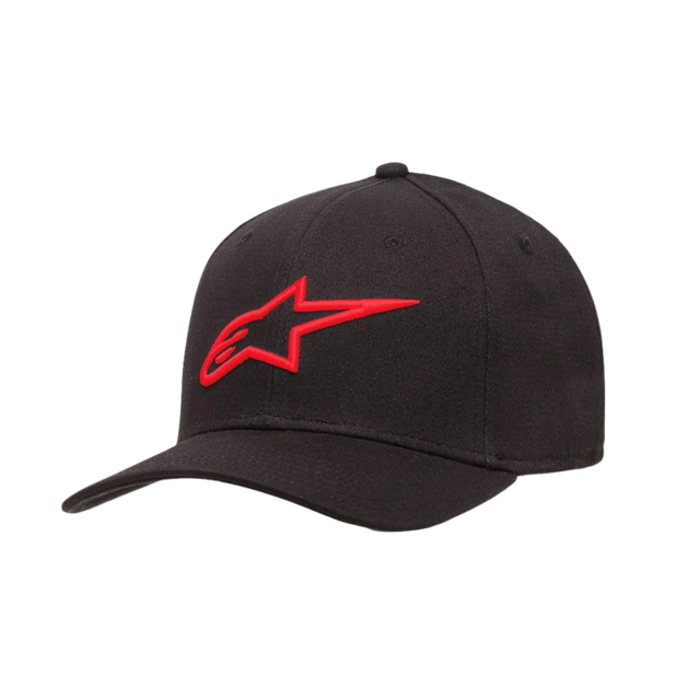 Alpinestars Ageless Curve Hat, Black and Red Baseball Cap, featuring a raised 3D embroidered red logo on the front, curved brim twill fabric, casual motorsport-inspired headwear