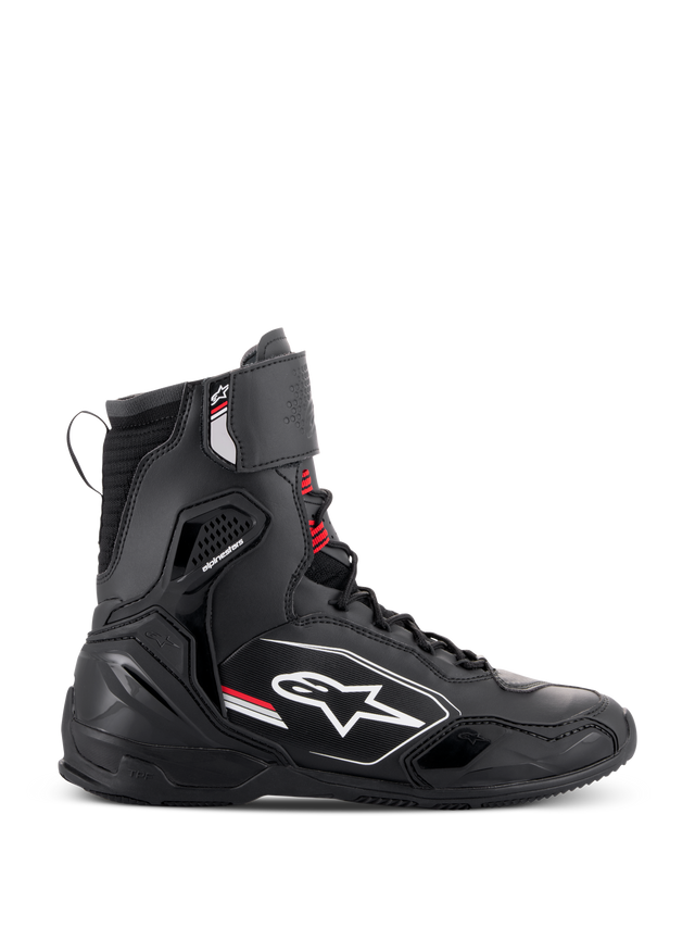 Shoe-like comfort with boot-like protection, the Superfaster Tech Riding Shoes measure around 25 cm tall which offers the rider better overall coverage, and more importantly, incorporates more sophisticated protection, such as the integrated lower shin impact protector as well as the new, semi-rigid internal ankle brace system featuring malleolus impact protection and an Achilles extension protector. Providing additional protection on the Superfaster’s upper portion are double-injected ankle discs, lateral TPR panels on the outer ankle, a reinforced TPU heel counter, and a TPR layered toe box with lateral toe slider reinforcement. The sole itself features the Alpinestars TPF transversal protection frame midsole which consists of various layers of protection to prevent the foot from bending or twisting in the wrong directions, while simultaneously including soft PU foam, an EVA heel cushion, as well as a removable and breathable OrthoLite® insole. The Superfaster is guaranteed to provide all-day motorcycling protection with all-day walking and standing comfort.The rest of the Superfaster’s chassis is constructed with advanced microfiber and Rideknit® panels with seamless thermo-welded parts and held securely in place on the rider’s foot with a speed lace system and a long medial side zip opening. The overall design is also sculpted with an engineered flex point for freedom of movement with a pre-bent forward construction for riding comfort, and a low overall profile to allow the Superfaster to easily fit under any riding pant.The Superfaster looks like an Alpinestars sport shoe in your denim, feels like your favorite sneaker when you walk because of the new sole. In addition, the Superfaster protects like a real boot with its tall height and full set of protection and offers a stylish look with the ultimate in protection and comfort.