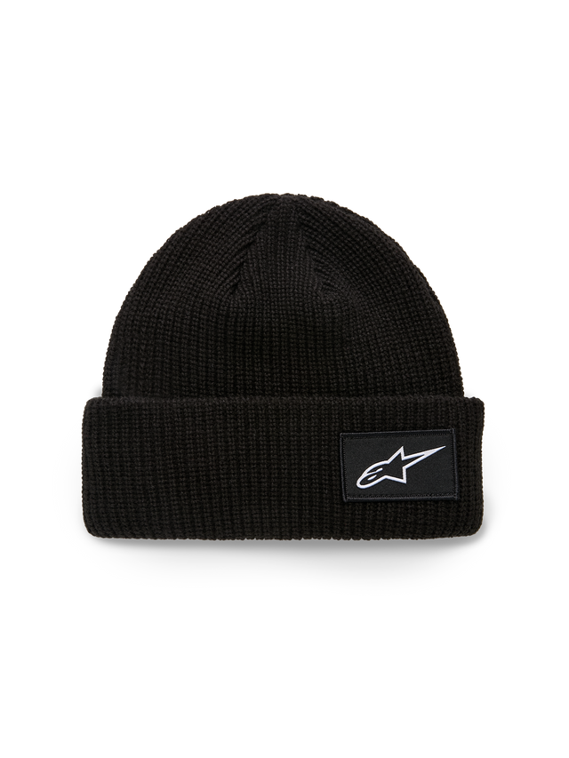 Alpinestars Unload Rib Cuff Beanie, Knit Beanie, Black, featuring a ribbed cuff with a white Astars logo woven patch, shallow fit, casual sportswear