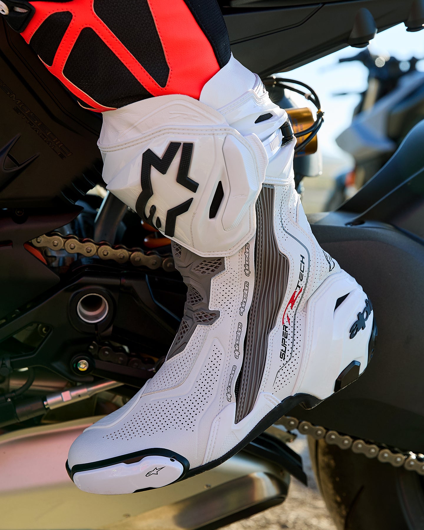 Featuring extensive perforations throughout for maximum airflow, innovations derived using feedback from Alpinestars involvement in top flight racing include a newly redesigned front flex area, a redesigned rear bellow, a redesigned top gaitor, a new shifter and shin plate, a new shin slider and a new inner bootie, all of which enhance the comfort, protection and the performance of this boot to a new class-leading hig