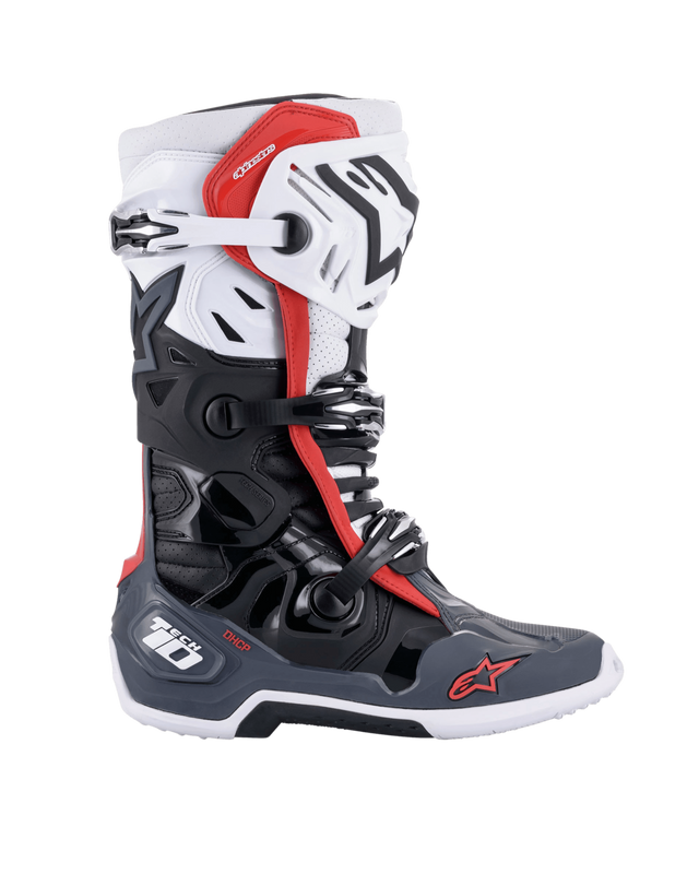 185C 2X (red alpinestars) RED FLUO 16 PINK FLUO 16 ORANGE FLUO 16 021C (orange) MEDIAL SIDE LATERAL SIDE Botte de référence en Motocross, la Tech 10 extrêmement aérée fait progresser les innovations qui en font la botte de motocross la plus technique de tous les temps. Dotée de deux orifices d'entrée a l'avant, d'un protège-tibia ventilé, d'un rembourrage perforé et de larges sections de mailles, la Tech 10 extrêmement aérée a été conue pour un débit d'air maximal a travers l'avant de la botte et un échange de chaleur efficace. La nouvelle chaussure intérieure en maille dispose d'une semelle intérieure 3D a ressorts supérieurs qui utilise des canaux d'air dans la semelle pour des niveaux optimaux de ventilation, tout en créant un effet d'amortissement pour des niveaux de confort améliorés. Il y a aussi une nouvelle semelle avec une conception longue en nid d'abeille pour une meilleure adhérence et sensation sur les chevilles de la moto, surtout dans les conditions humides et boueuses.