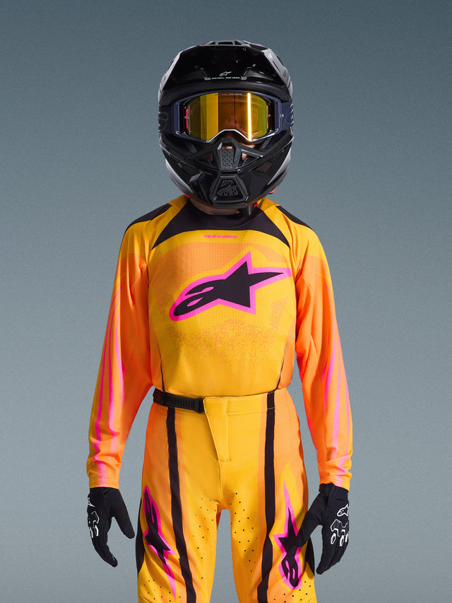 Maillot Junior Alpinestars 2026 Supertech Nomur, maillot de motocross, orange, jaune et rose, vue arrière d'un jeune pilote portant un casque et un pantalon assortis, logos audacieux et coupe athlétique pour la course tout-terrain